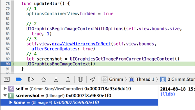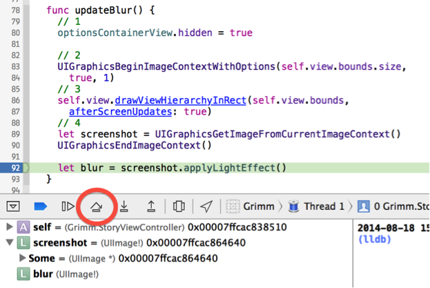 在你的上一步添加的updateBlur方法源碼中找到UIGraphicsEndImageContext()這一行並添加一個斷點,然後構建並運行,選擇一個童話故事並打開它。