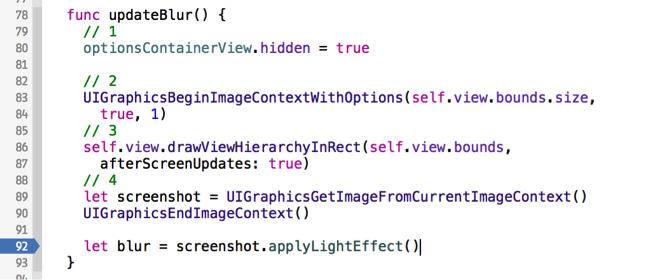 在點擊省略號之後你需要調用一個updateBlur方法來模糊截圖,這樣你需要在setOptionsHidden方法的一開始添加如下代碼: