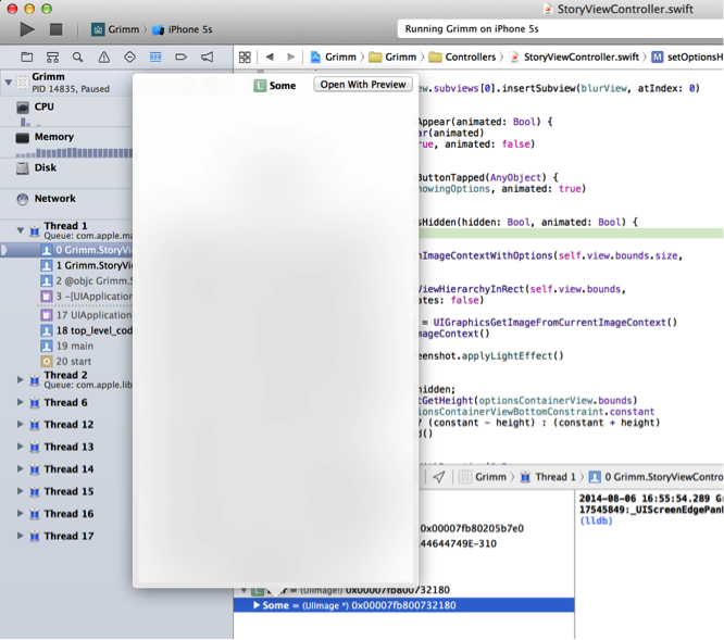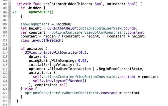 打開StoryViewController.swift文件並找到setOptionsHidden方法,在這裡你會先獲取整個StoryViewController控制器的截圖,然後在將其模糊化之後作為選項界面的背景圖片。
