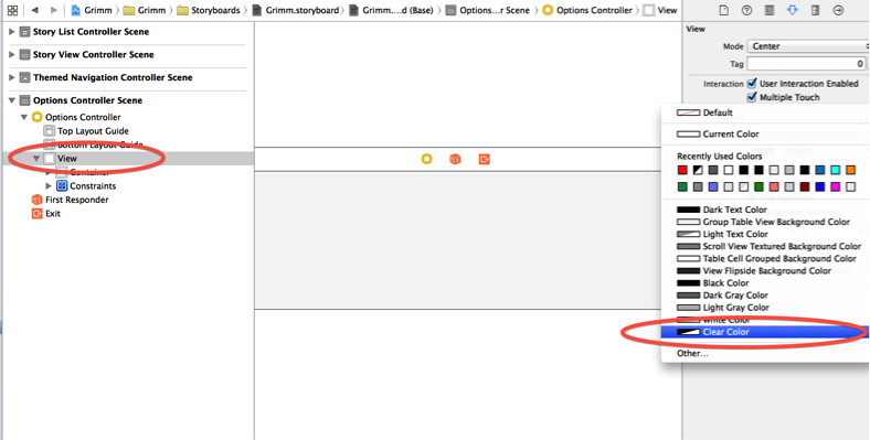 打開Grimm.storyboard然後找到Options Controller Scene,選擇view,展開Attributes Inspector然後更改view的background為Clear color,如下: