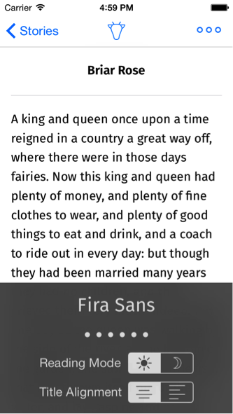 該應用為用戶提供了一系列的童話故事,當用戶點開某個童話時,它就會在屏幕上顯示完整的故事內容。用戶可以自定義顯示的字體、文本對齊,以及適用於日間或夜晚閱讀的顏色主題。