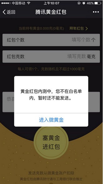 然後,在微黃金頁面點擊“黃金紅包”,騰訊微黃金公眾號會提示你“黃金紅包內測中,您不在白名單內,暫時還不能發送”。