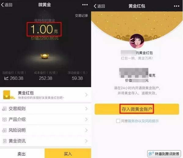 “開”紅包就可領取黃金份額,然後存入微黃金賬戶(沒有的需要開通),不過交易用戶必須在微信上進行實名認證。