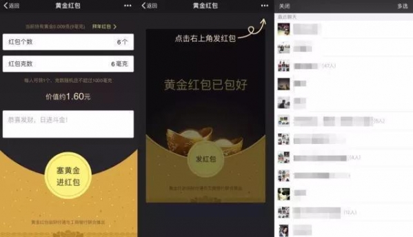 我們也可以在微信群裡發紅包,基於風險控制及消費者權益保護的相關要求,“黃金紅包”采取了一個不超過1克的限制。