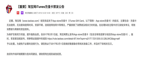 2016 年 12 月 30 日,淘寶官方發布聲明稱,由於遭到大量買家投訴買到的 App Store 充值卡無法使用,淘寶網將禁止售賣 App Store 充值卡(iTunes Gift Card),這項規定將從今年 2 月 1 日起執行。