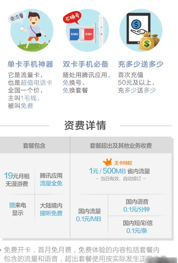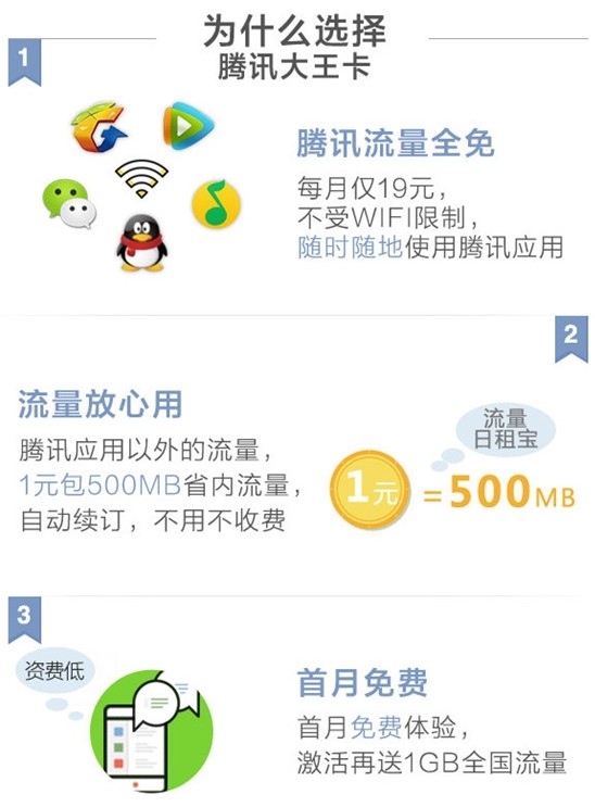 除了可以享受騰訊應用免流量的服務,騰訊王卡還默認開通日租寶(1元500MB省內流量),不用不花錢。 開通王卡後,還可立即獲得價值100元的1GB全國流量半年包。