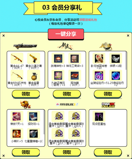 心悅會員&京東會員,分享活動可領取游戲禮包(每款禮包單Q限領一次)