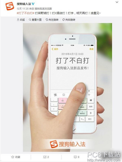 相信很多小伙們手機上都安裝了搜狗輸入法這款應用,因為搜狗輸入法被稱為史上最好用的輸入法,也是最了解用戶的輸入法,很多蘋果用戶也都安裝了這款輸入法。近日,搜狗輸入法表示將在明天發布一款新品,號稱“打了不白打”,時間定為2016年4月1日 0:00,也就是愚人節。