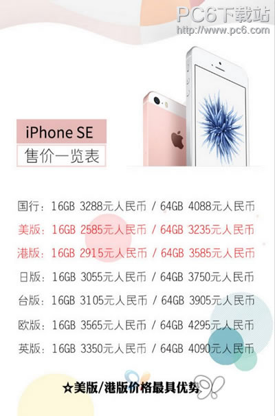 不同國家地區,iPhone SE的售價也不一樣。以下是PC6下載站匯總了適合國內用戶購買的版本售價,包括國行、港行、美版、日版、台版、歐版和英版。目前國內用戶購買iPhone手機,比較靠譜的無非是四種渠道:大陸、香港、美國、日本,那麼到底選擇哪一個版本好呢?