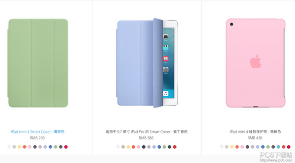 在發布會結束後,蘋果默默地在官網商城推出了新款的官方保護套。iPad mini 和新款 9.7 英寸 iPad Pro 的官方 Smart Cover 顏色多達 11 種,而 iPad mini 4 與 iPhone 6s / 6s Plus 的官方硅膠保護套顏色達到了前所未有的 14 款。更輕快的顏色給了消費者更多的選擇。除了硅膠殼推出更多配色,質感更為細膩的真皮質保護套的配色也增加了好幾款。