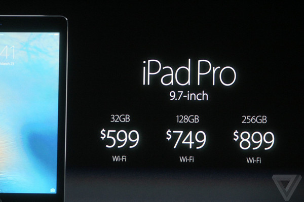 9.7英寸iPad Pro新增玫瑰金顏色,其它還有白色、黑色和金色,售價方面,32GB/128GB/256GB售價分別為599/749/899美金(約合人民幣3882/4854/5826元),將於24號接受預訂,31號開賣。
