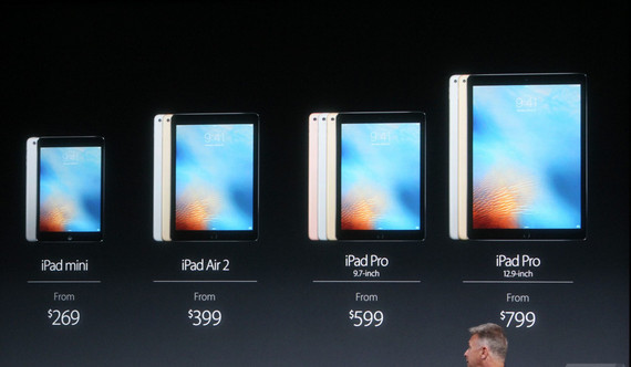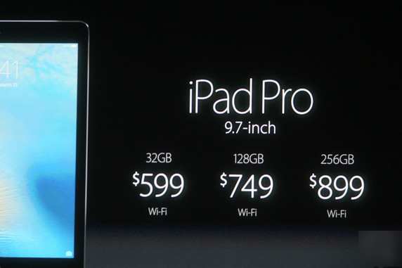 32GB 9.7英寸iPad Pro售價WEI 599MEIYUAN ;128GB售價為749美元;256GB售價為899美元。該產品將於3月24日接受預定,發售時間為3月31日。