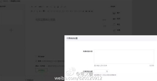 據報道,微信公眾號後台文章編輯頁面將添加一個“付費閱讀設置“的選項,讓公眾號管理者可以為文章設置閱讀收費。