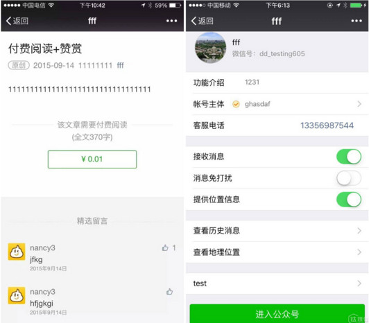 截圖來自於一個名叫『fff』的測試賬號,根據這個賬號歷史消息內容,以及信息亂填能夠獲得認證等證據來看,此賬號應該是屬於微信官方。基於此可判定,不論是否上線,『付費閱讀』功能進入測試階段已是無疑。