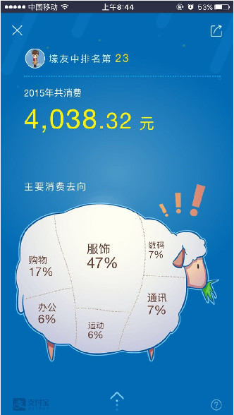 同時,在今天支付寶所屬的螞蟻金服務也更新了一些2015年國民消費數據。螞蟻金服先以大數據的方式對全民的網絡新經濟轉型、社會生活熱點和消費方式進行了觀察。