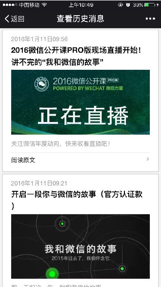 其實,相信小伙伴們更關心的是昨天的那個“2016開啟一段你與微信故事”的>>>活動入口<<<,網友們只需要關注“微信公開課”,然後查看歷史消息,倒數第二條就是活動入口(如下圖所示)。