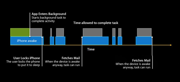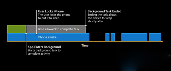 在iOS 7之前,如果應用在後台運行,那麼即使你已鎖屏了,這些應用還會繼續運行,你的iPhone一直處於喚醒狀態,直到後台應用完成任務或超時才能進入休眠。