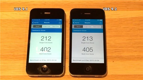 從視頻中可以看到,在開機方面,運行iOS9.2的iPhone4s要明顯較快一些。而在開啟原生應用方面,iOS9.2的iPhone4s的響應總體來看可能會更快一些,但優勢也不明顯,第三方應用方面,兩者的差距也在毫厘之間。