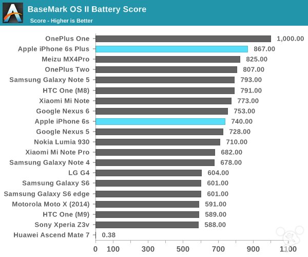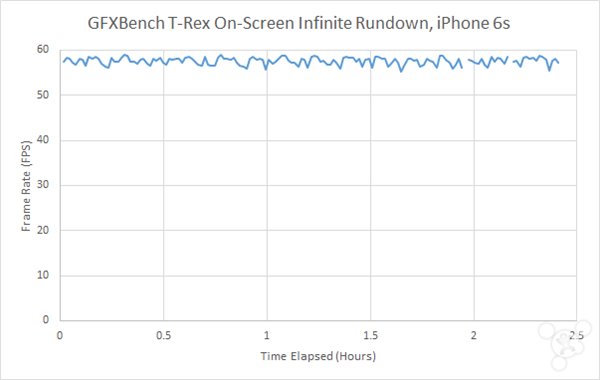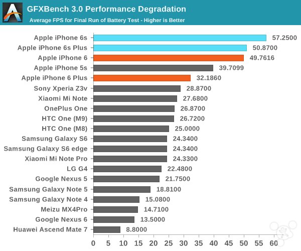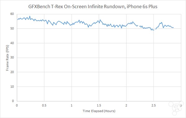 為了測試在極端使用情況下的iPhone電池續航,AnandTech使用Basemark OS II和GFXBench來給CPU和GPU“施壓”,看看在這樣的情況下設備的電能損耗如何。同時我們也能知道在相對持續的高負載下哪些部件會降低性能。不過要指出的是,因為某些原因Basemark OS II和GFXBench的測試結果沒有Android設備的那麼准確。