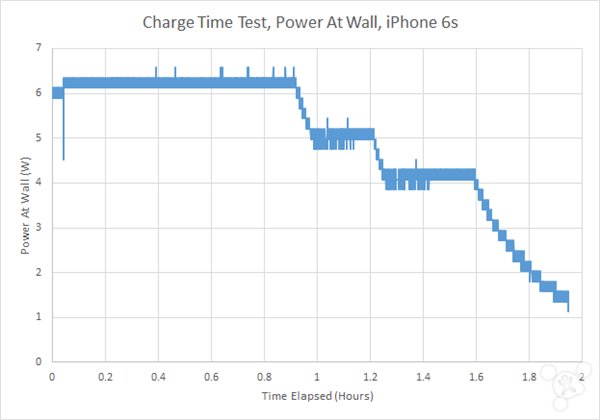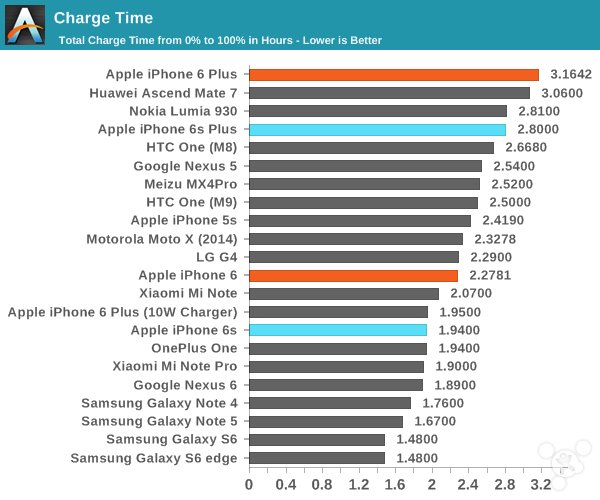 雖然電池續航是決定設備整體移動性的主要因素,但是充電時間也是一個重要的因素。一款手機如果它的充電時間過長,那麼它的移動性當然不及其他充電較快的設備。iPhone 6s仍然配備5W充電器。測試是看設備從完全沒電到完全充滿需要多長時間。