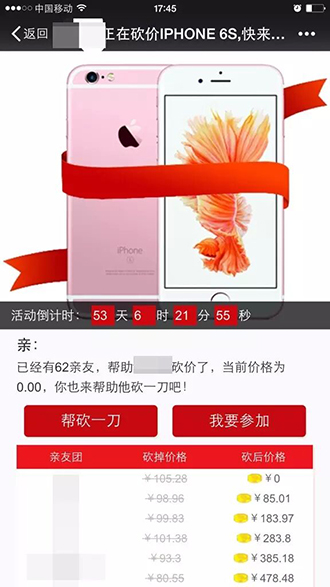 最近朋友圈盛行“幫忙砍價”的活動,據稱經過眾多好友的幫忙,可以將原價5288的iPhone 6s砍到“一元購”。那麼朋友圈“幫砍價”是騙局嗎?幫砍價免費拿東西到底是真的假的呢?