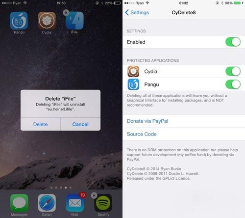 Cydetele8 可以像刪除 App 一樣在桌面刪除所有“有圖標的插件”,比如各種輸入法,iCleaner Pro,冬青鼠之類的,省去了去 Cydia 找刪除按鈕的麻煩,但是它對設置內的那種插件不起作用。