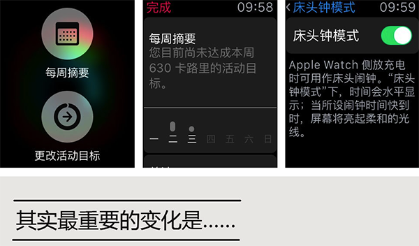 當然watchOS 2還有一些可能不是那麼容易察覺的小細節變化,比如我個人很喜歡的床頭鐘模式,只要把Apple Watch側放充電,就可以成為一個顯示時鐘、鬧鐘的簡易床頭時鐘,呃,這是不是受到了moto 360的啟發?