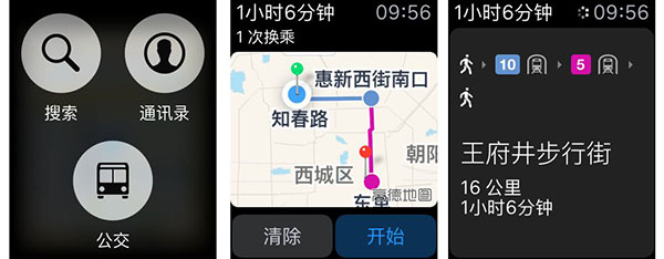 另外,由於iOS 9的改進,一些原生App的使用功能也有了更新,例如蘋果地圖能夠支持公交路線的規劃了,這樣你在Apple Watch上就可以不掏出手機而只跟著手表的提示走了,這在外出旅游的時候特別有用,但以往只有步行和駕車模式,感覺就像缺一條腿兒似的,現在總算補齊了。