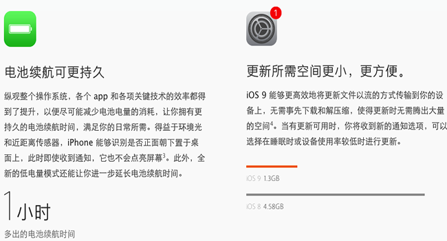 全新的省電模式,iOS 9 會讓你的 iPhone 以及 iPad 更省電,電力可以比之前延長 1 個小時。此外 iOS 9 提供了省電模式,下次看到發紅的電池不用那麼心驚膽戰了。更小的升級空間,升級 iOS 9 的時候你不用騰出 4.58 GB 的空間了,現在只需要 1.3 GB。