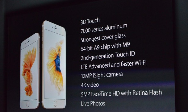 9.10 凌晨 02:30 iPhone 6S 正式發布,擁有Force Touch 功能,名字叫做“3D Touch”,新 iPhone 的屏幕采用了高強度的 Ion-X 玻璃,而不是藍寶石,機身顏色包括了銀色、金色、灰色和玫瑰金。