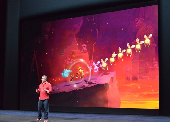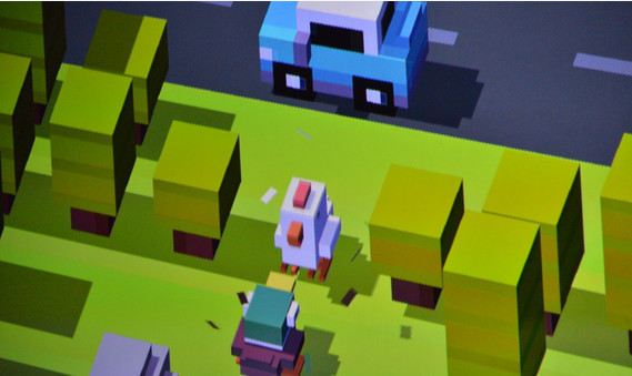 現場演示如何使用Apple TV玩Crossy Road游戲。現場演示如何使用Apple TV玩Crossy Road游戲。Apple TV 的 Demo 時間,一款 iOS 上非常流行的游戲 Hipster Whale's,有了帶觸控板的遙控器還真是能夠在電視上玩游戲了。