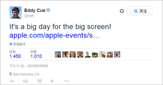 9.10 凌晨 0:55 蘋果互聯網軟件和服務高級副總裁 Eddy Cue 的一條 twitter 指向了 big screen,這是說 iPad Pro 還是 Apple TV?