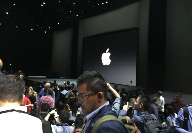 9.10 凌晨 0:40 經歷了漫長的等待,與會者終於進會場啦,看到遠處的大屏幕沒?這就是蘋果今天要發布的神秘新品---大彩電!當然只是開個玩笑而已。