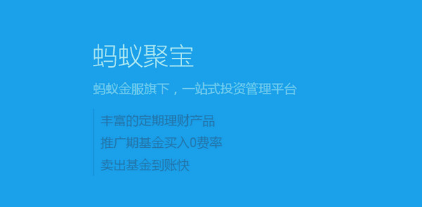 螞蟻聚寶提出“簡單理財”理念,提供“活期”、“定期”和基金等多種理財類型,其中基金認購費低至0%,贖回速度為T+1。