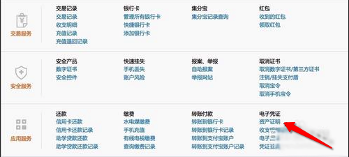 2、接著在自助服務頁面中,位於右下方可以看到有“電子憑證”欄目,這裡以開一張資產證明為例,如圖所示