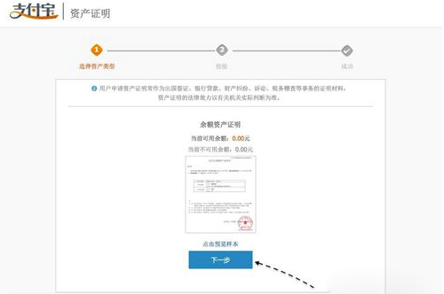 3、隨後會顯示一張電子資產證明的預覽格式,點擊“下一步”按鈕繼續,如圖所示
