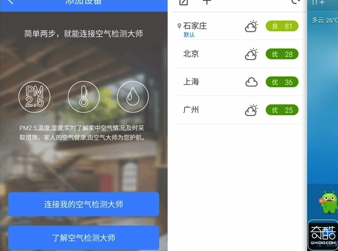 5、APP可以實時的刷新采集的數據,而且還有你所在當地的空氣質量情況,如果你的設備是接入wifi的,那你只要手機有APP,你身在何處都可以隨時查看家中的空氣環境情況,實時掌握。