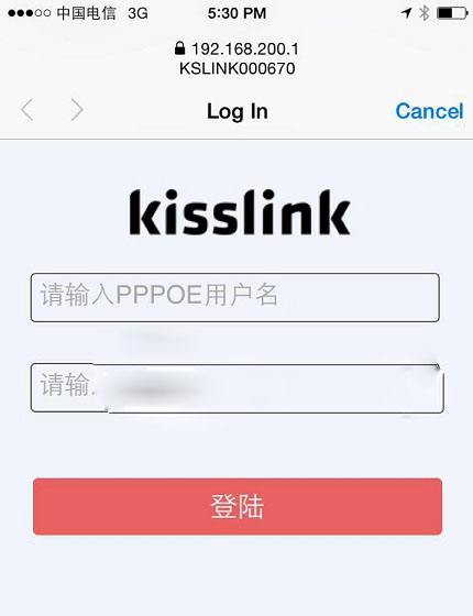 三.當聽到提示音時,表示您的手機已經認證成功。此時請稍等3-5秒,kisslink會自動在手機界面中彈出一個路由器設置頁面,初次設置路由器需要您輸入寬帶賬號密碼,完成後點擊登陸,如下圖所示。