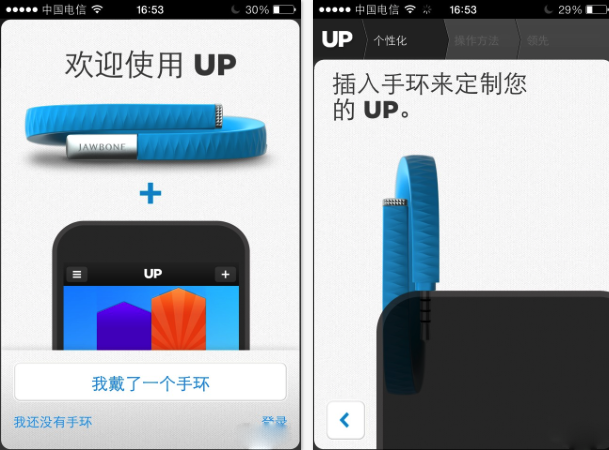 左圖是UP應用的初始界面,我們點擊“我戴了一個手環”的選項,即進入了提示頁面,按照提示,將手環插入手機的耳機插孔(按照圖示的方向插入,更容易識別到手環),應用會自動識別設備,並進入到個人信息設置頁面。