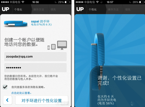 設置的最後,我們理所當然的要填入一個注冊帳號和密碼,這個帳號是我們健康數據的保存和訪問憑據,請牢記密碼並妥善保存。點擊“對手環進行個性化設置”選項,稍後設置完成,同時可以看到手環的電池情況。接下來是一連串的幫助頁面,您可以快速預覽,我們接下來會分部進行詳細介紹。