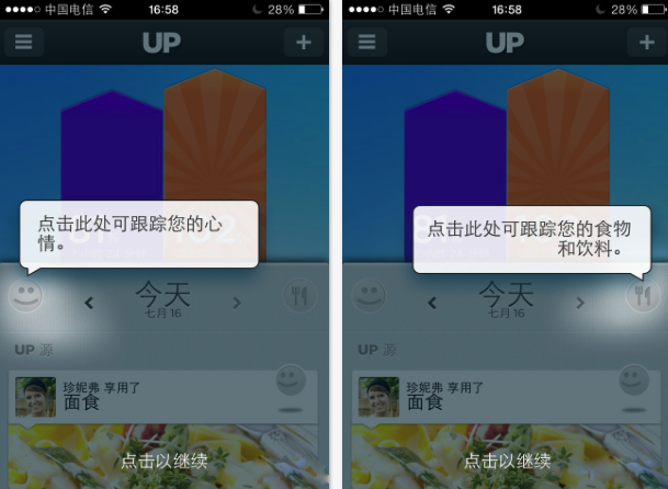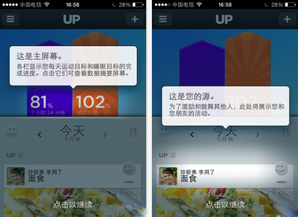進入UP應用的主界面,我們首先會看到兩個醒目的柱狀圖,藍色代表我們的睡眠達成率,橙色代表運動達成率,幫助我們快速預覽自己的健康度。中間位置是當前日期,我們可以左右切換查看過往數據。