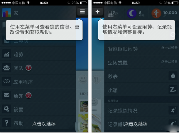 我們來看看鬧鐘的設置方法,點擊+號或者左劃屏幕調出菜單,點擊智能睡眠鬧鐘選項,進入設置界面,這裡有一個簡單的幫助頁面,點擊“插入 UP 手環”選項,進入設置界面。