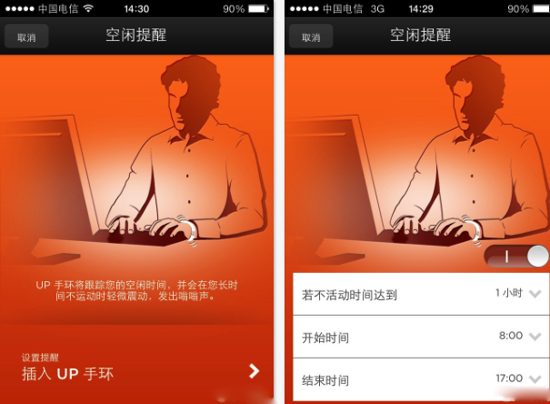 手環的空閒提醒功能非常實用,尤其對於工作狂,經常會忘記休息,空閒提醒就可以解決這個問題,當手環檢測到我們長時間保持一個姿勢沒有運動時,會通過振動進行提醒,此時我們可以停下工作望望遠處,伸伸筋骨,別看是個小功能,對健康的益處卻很大。