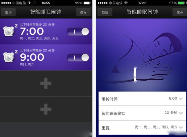 這裡首先解釋一下什麼是智能睡眠鬧鐘?睡覺的時候佩戴 UP 手環,它可以偵測我們整晚的睡眠動作,從而算出我們的深睡眠和淺睡眠時間,手環根據這個數據的好壞來判斷我們的睡眠質量,如果睡的好,就會提前叫醒,如果睡的不好,就准點叫醒,這跟以往的單一鬧鐘有了很大的區別,可以在保證我們睡眠質量的同時,提高我們的效率,因此而智能。