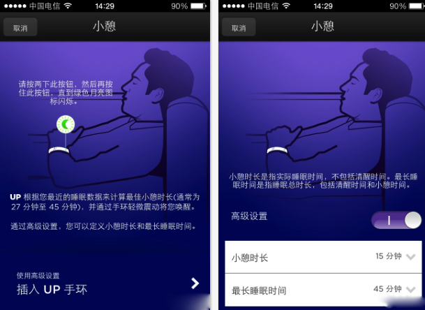 小憩功能是針對午休設計的,同樣是一個智能型短時鬧鐘,內置一個最佳的小憩長度和一個最長睡眠時間,手環會根據你昨夜的睡眠質量來計算你的最佳小憩時間,適時提醒你醒來,非常實用,保證午休不過頭,也不浪費時間。