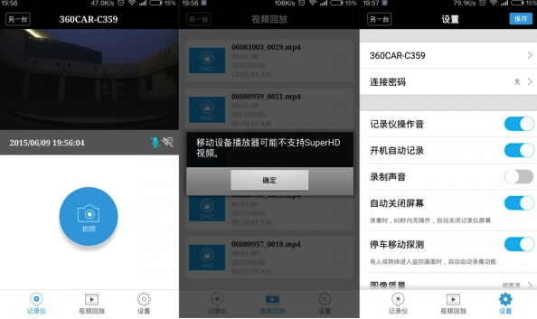 App 中提供了畫面預覽、視頻回放和對行車記錄儀的設置功能,都還算比較實用的功能。我可以通過手機端直接來播放記錄在 TF 卡中的視頻,還可以直接通過 App 把視頻下載到手機端進行保存,如果在行車過程中遇到那些說不清的事,可以十分方便的把證據給警察叔叔看,還是蠻方便的。不過手機端暫時只支持 1080p 分辨率錄制的視頻,而在最高的 1296p 分辨率下錄制的視頻是無法通過 App 進行預覽的。
