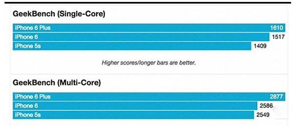除了大型游戲、大數據音樂編輯以及以及設計處理之外,新款 iPod touch 在運行各種各樣的 App 都沒有問題。新款 iPod touch 和 iPhone 6 之間的系統流暢度並沒有明顯的差距,下圖附上了這兩款設備以及 iPhone 5s 的跑分圖。