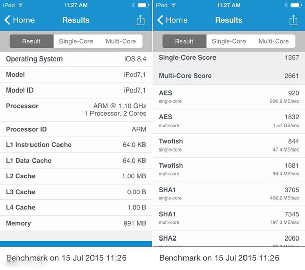 上一代 iPod touch 搭載了 A5 處理器,單核得分為 215,多核得分為 410。這也意味著全新第六代 iPod touch 是上一代 iPod touch 性能的6倍。