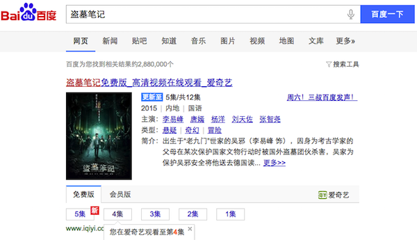 首先大家可以下載一個愛奇藝的客戶端,手機和電腦都行,小編為了方便起見將就直接使用web觀看了,大家百度盜墓筆記,就能直接搜索到該影片: