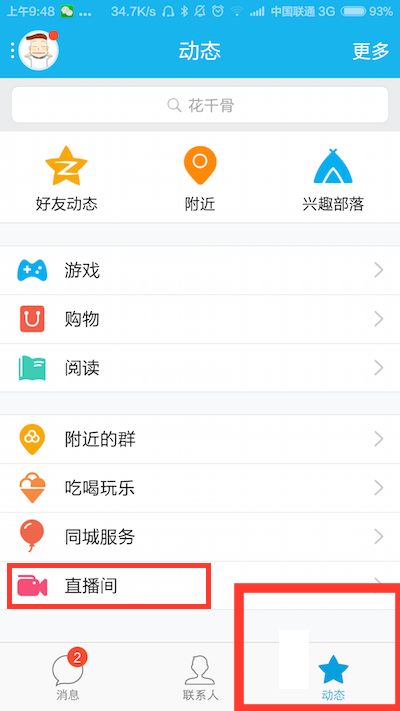 首先用戶需要進入QQ頁面,點擊“動態按鈕”,就會看見手機QQ直播間:
